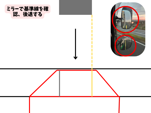 👉 目視やサイドミラーで確認しながらまっすぐにさせます。