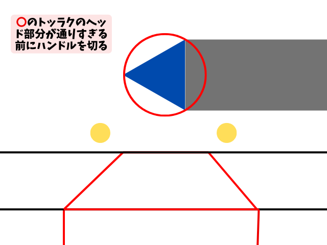 👉トラックのヘッドが入庫口にトラックのヘッド部分が「差し掛かったな」くらいでハンドルを回していきます。